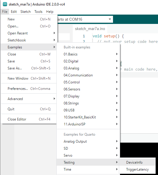 If you aren't sure what firmware version of the Quarto you have, open the DeviceInfo example under Testing: