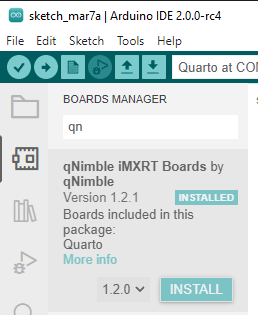 To use the SD card, first in the Arduino IDE, go to Boards Manager and install the latest (1.2.x or higher) version of "qNimble iMXRT Boards by qNimble"