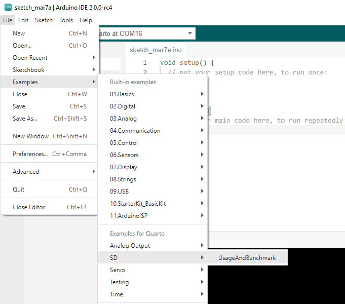 Then you can put a SD card in the Quarto and run the example to do some basic operations and to benchmark the SD card. Or look at the example code to see how to list files, change directories, read and write files, etc.